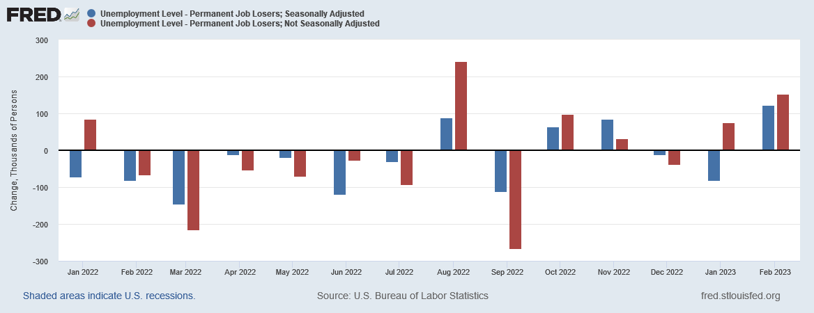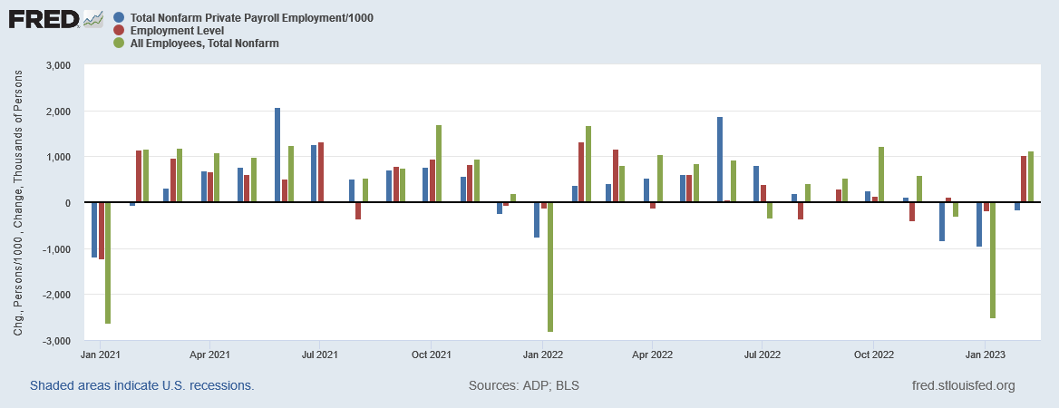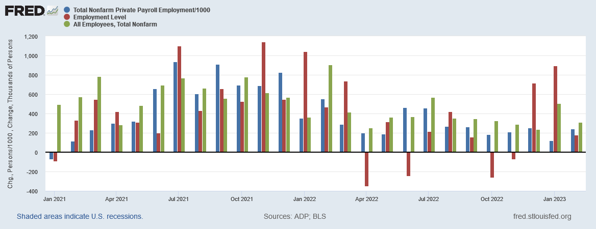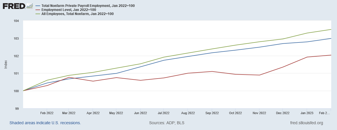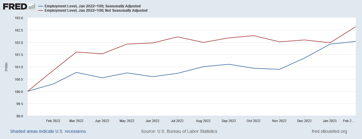 In particular, we have to believe that February saw a surge of employment, despite there having been a decided collapse in job creation during the last half of 2022, per the BLS jobs data.