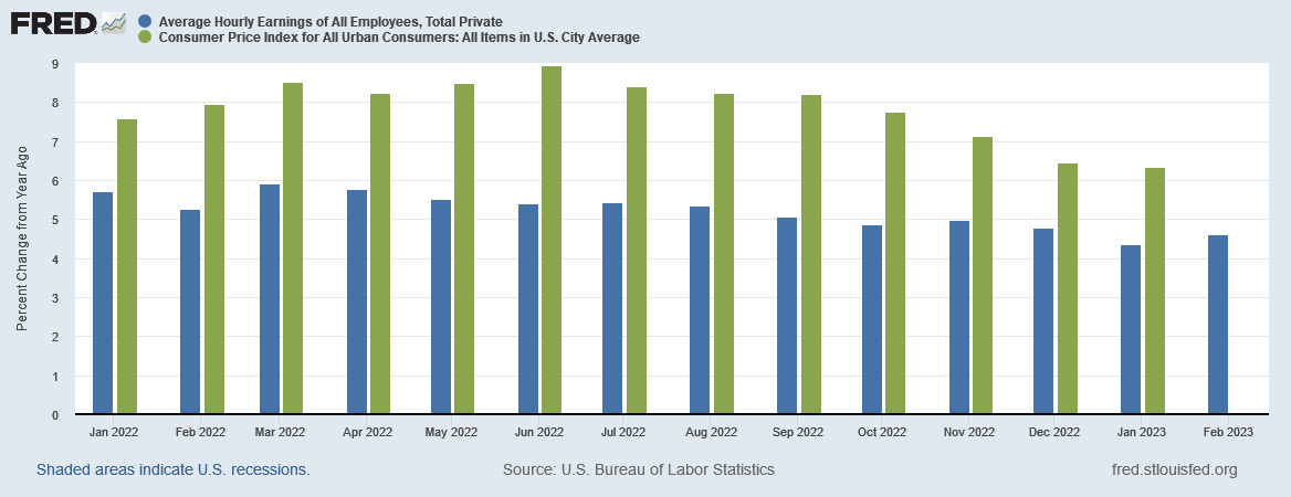Pay no attention to the year on year consumer price inflation, which outpaced year on year average hourly earnings gains for all of 2022—meaning real wages declined throughout 2022.