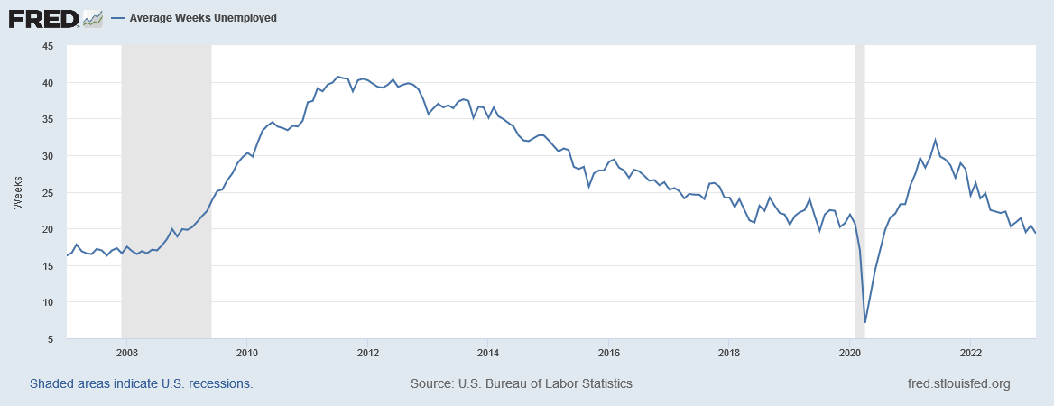 Ignore the fact that the average duration of unemployment at 19.3 weeks is still higher than it was before the 2007-2009 Great Financial Crisis and recession—nearly 16 years ago.
