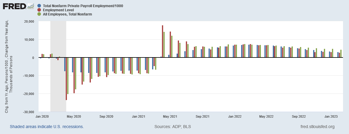The ADP report, however, has shown declining job growth year on year since then. Moreover, the ADP report shows a largely similar decline when viewed month on month, albeit from an earlier peak of August 2021.