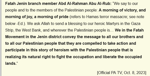 While Israel counted more than 600 dead, 2,000 wounded, and around 100 hostages, a Fatah official said that this is a “morning of victory, joy, and pride.” He then urged all Palestinians to participate in the terror against Israel – in what he termed “this story of heroism”: