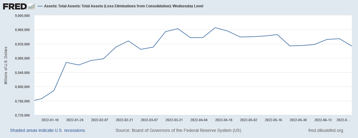 If one follows that logic, the bond markets are pricing in an expectation the Fed will respond to the reality of a recession by reversing its recent interest rate hikes and “restarting” Quantitative Easing policies. However, that logic runs aground on the fact that the Fed has yet to meaningfully reduce its balance sheet, which is still up significantly from the start of the year.