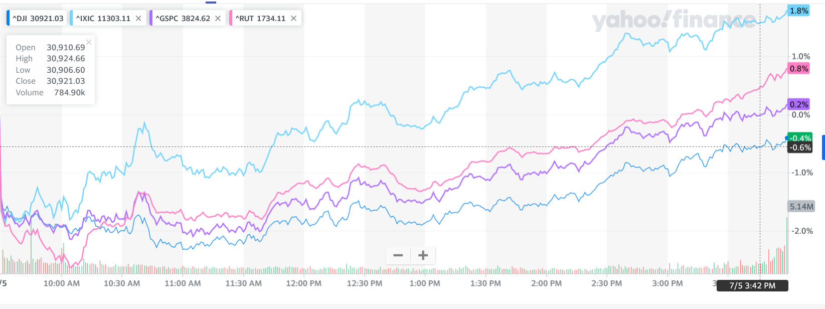 The first day’s trading activity after the Fourth of July holiday weekend was a chaotic and confused mess of buying and selling, with trading volume somewhat higher than in recent trading sessions. What started as a down day with significant declines on all major indices ended up a mostly positive day, with even the Dow only just missing making it into positive territory for the day.