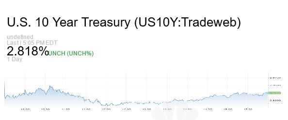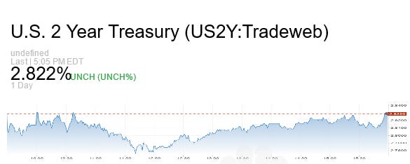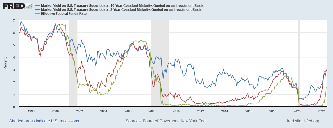 Not only is the stock market activity from mid-morning on contrary to what recession fears should trigger, but the bond markets are signalling an expectation that the Fed will back off its campaign of interest rate hikes to curb inflation—historically, yields move down when there is at least the expectation the Fed is likely to cut interest rates, and are pushed up when the Fed signals an intention to raise rates.