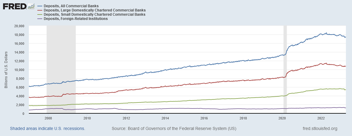 However, putting the onus of deposit flight on wealthy depositors conveniently ignores why the deposits are fleeing First Republic—deposits are flowing out of First Republic because deposits are flowing out of the banking system as a whole, and have been since the Federal Reserve began its campaign to push up interest rates.