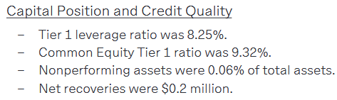 The Common Equity Tier 1 ratio (CET1) is double what the Fed mandates for large banks. That should be a depiction of financial health, not financial weakness. Non-performing assets is significantly below the national averages.