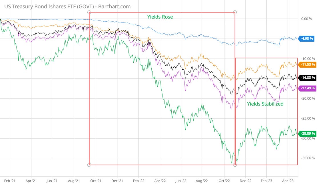 Tracking various Exchange Traded Funds focused on US Treasuries, the market value of these funds—and the market value of the underlying securities issuances by extension—have dropped nearly 15% overall, and nearly 30% for 10- and 20- Year Treasuries over the past two years with the bulk of the decline coinciding with the period of interest rate increases.