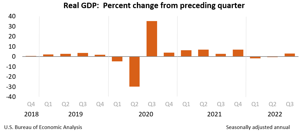 The GDPNow model estimate for real GDP growth (seasonally adjusted annual rate) in the fourth quarter of 2022 is 3.4 percent on December 6, up from 2.8 percent on December 1. After recent releases from the US Census Bureau, the US Bureau of Labor Statistics, and the Institute for Supply Management, increases in the nowcasts of fourth-quarter real personal consumption expenditures growth and fourth-quarter real government spending growth from 3.2 percent and 0.8 percent, respectively, to 3.7 percent and 1.1 percent, respectively, were slightly offset by a decrease in the nowcast of fourth-quarter gross private domestic investment growth from 2.0 percent to 1.7 percent. Also, the nowcast of the contribution of the change in real net exports to fourth-quarter real GDP growth increased from 0.16 percentage points to 0.37 percentage points.