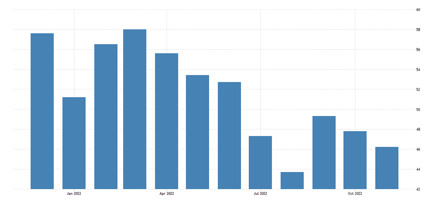 Year on year, new orders trended down from June until September, and continued the decline after a momentary uptick in September.