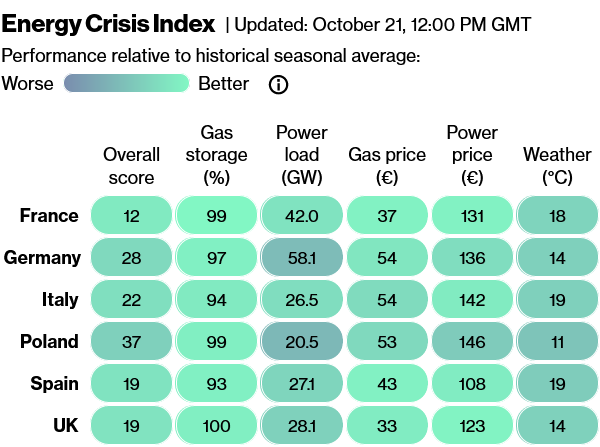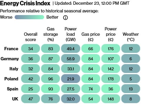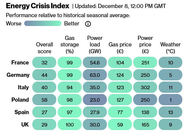 Yet Bloomberg’s Energy Crisis Index certainly seems to show the UK in an energy crisis. While the index scored Britain at 19 on October 21, by December 8 Britain’s score had risen to 29.