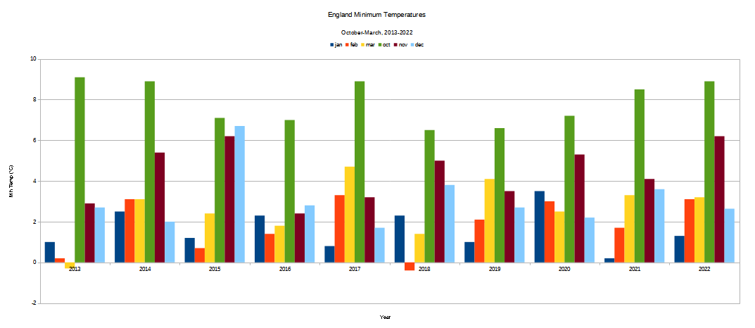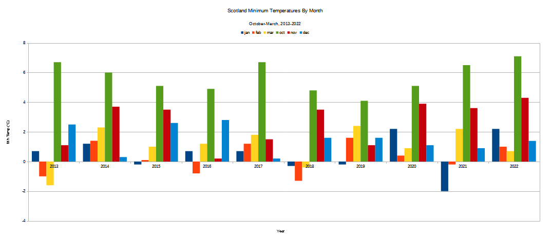The energy crisis narrative is further undercut by the minimum temperature data for England and Scotland over the past ten years. Cold snaps not withstanding, the minimum temperatures for both Scotland and England were rather unremarkable for December.