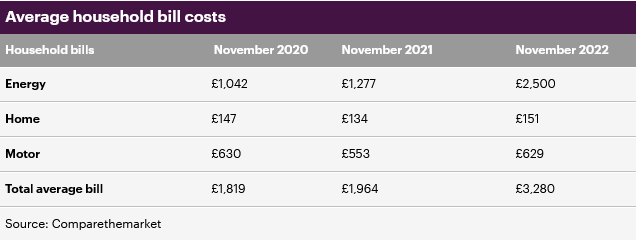 Energy costs have risen the most as the average bill has surged by £1,223 over the past year, according to comparison site Comparethemarket.
