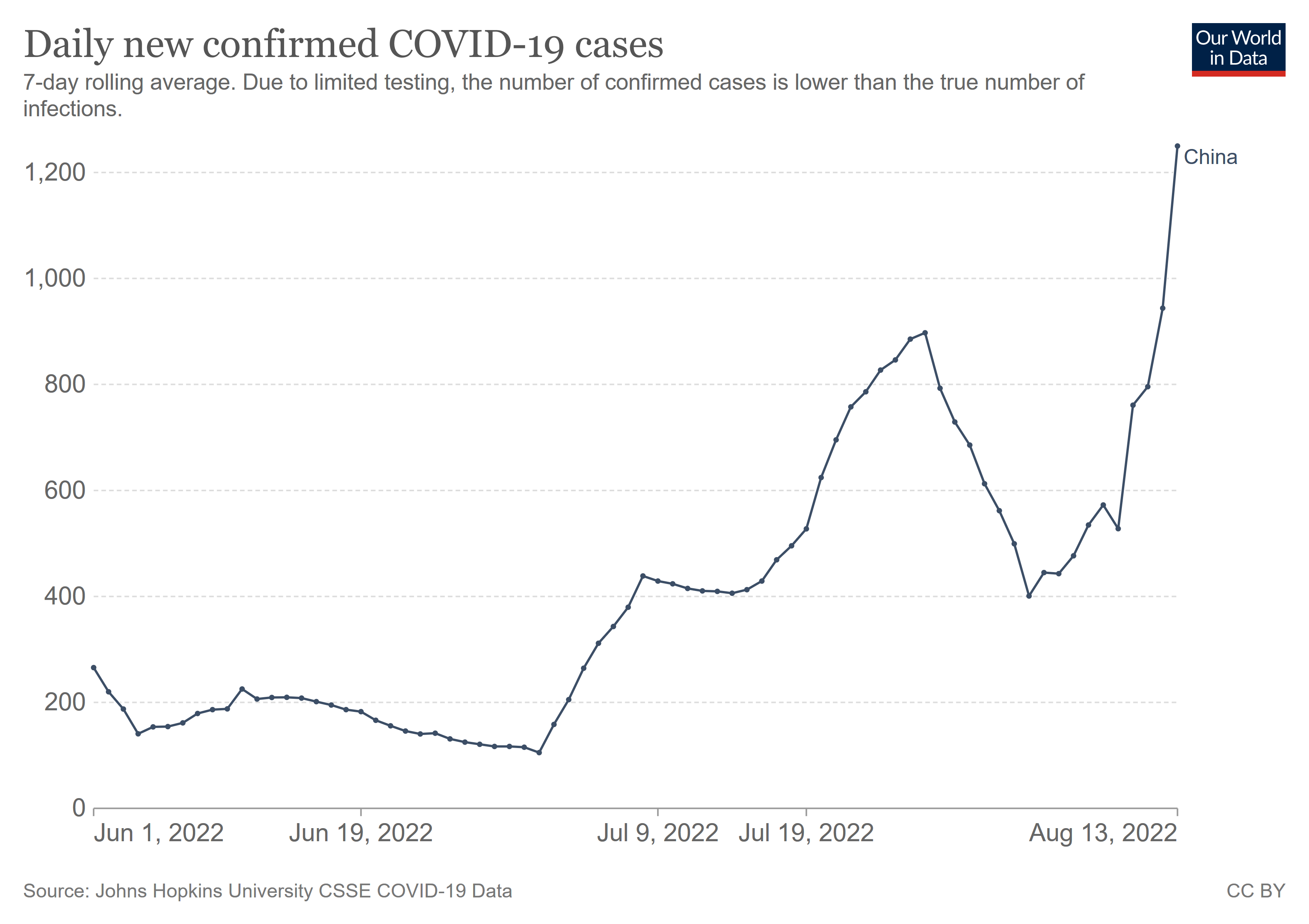 Cases have been climbing steadily in China since August 3, and the lockdowns of Sanya and Yiwu a week ago have had no impact on that trend.