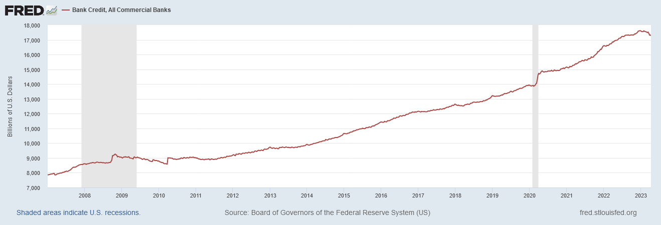 In absolute terms, bank credit in the US peaked last December, and has since been declining, the first extended decline in since the 2008-2009 Great Financial Crisis.