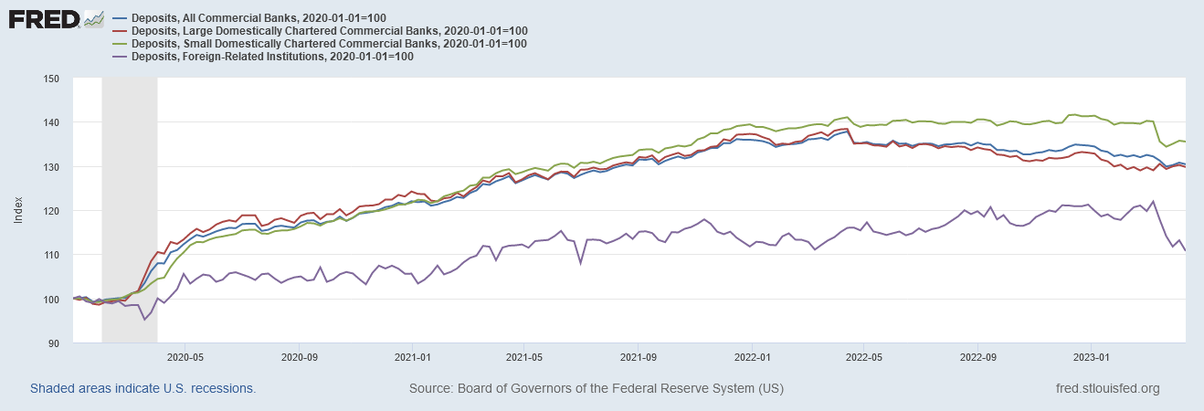 If we index to January, 2022, the total deposits at large domestically chartered banks, small domestically chartered banks, all domestically charted banks, and foreign institutions, we quickly see that declining deposits are a phenomenon everywhere but at foreign institutions.