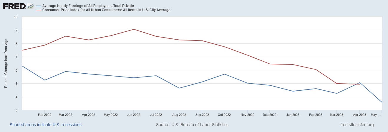 That part of the jobs report the corporate media and the demented regime in the White House hope you’ll be too busy laughing at the absurdity of their jobs claims to notice the long, deep, and ongoing screw job workers are getting on their pay rate because of uncontrolled inflation.