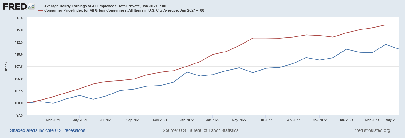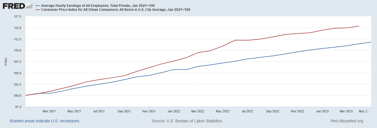 The seasonally adjusted indexed values aren’t any better: 11.4% pay gains vs 15.3% inflation gains since January 2021.