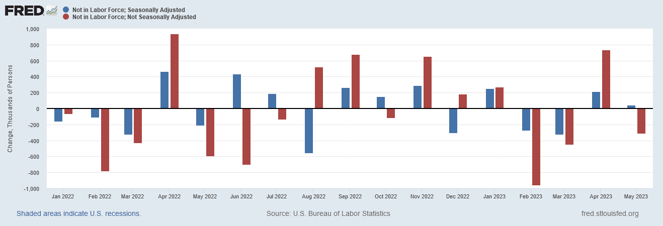 It makes sense that the seasonally adjusted cohort of workers not in the labor force could rise by 45,000 workers, with the unadjusted cohort not in the labor force falling by 306,000 workers, in the same month that a seasonally adjusted 339,000 new jobs were created.