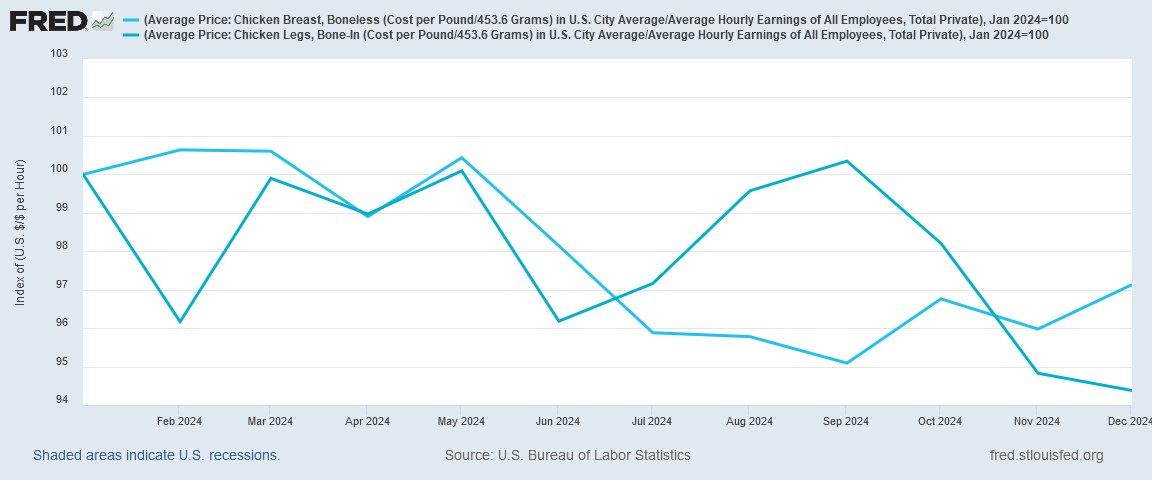 Yet while we are seeing numerous indicators that inflation is trending up, wage trends have mitigated at least some of it. When we look across nearly all food categories, we see the labor cost for food items trending down especially in the last half of 2024.