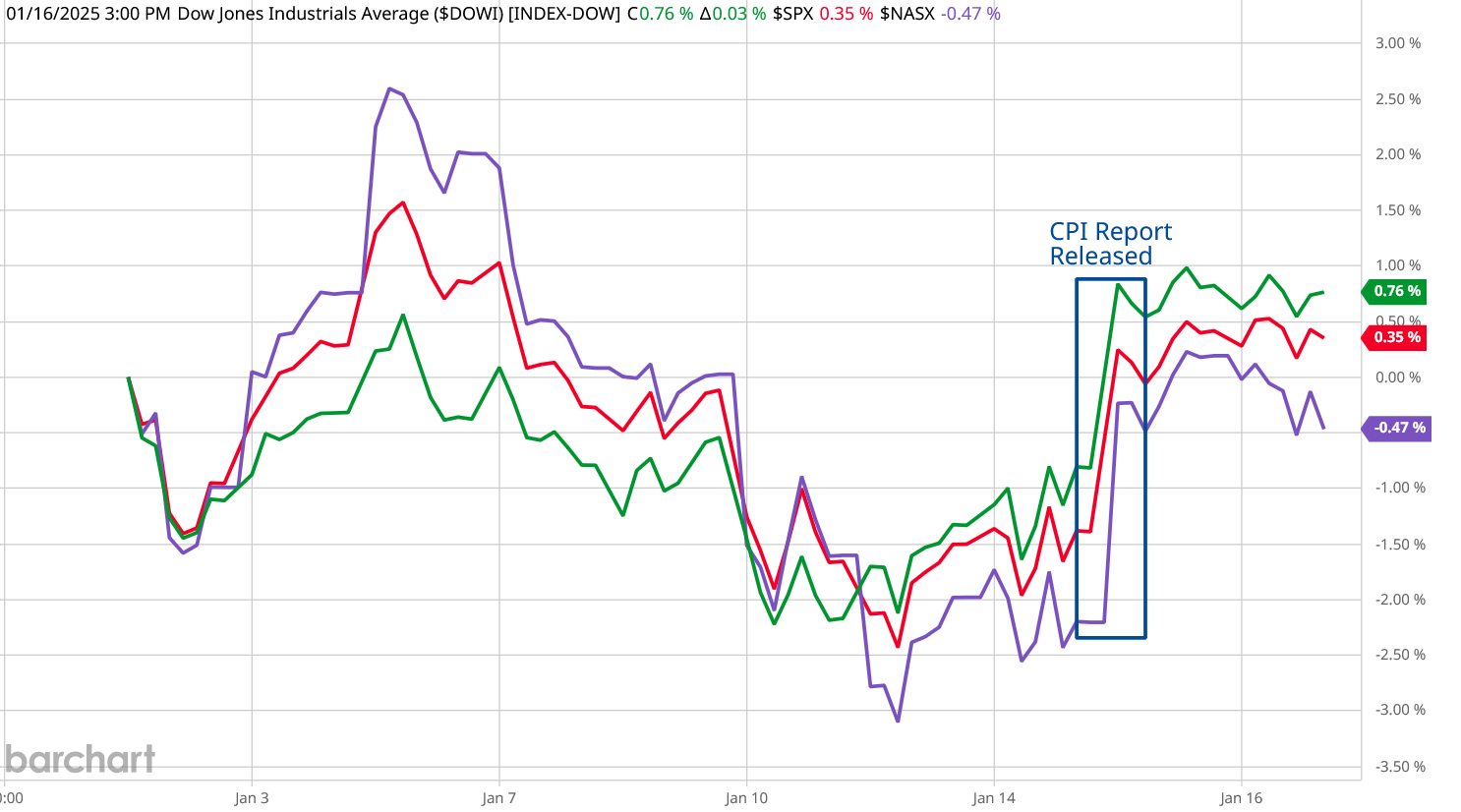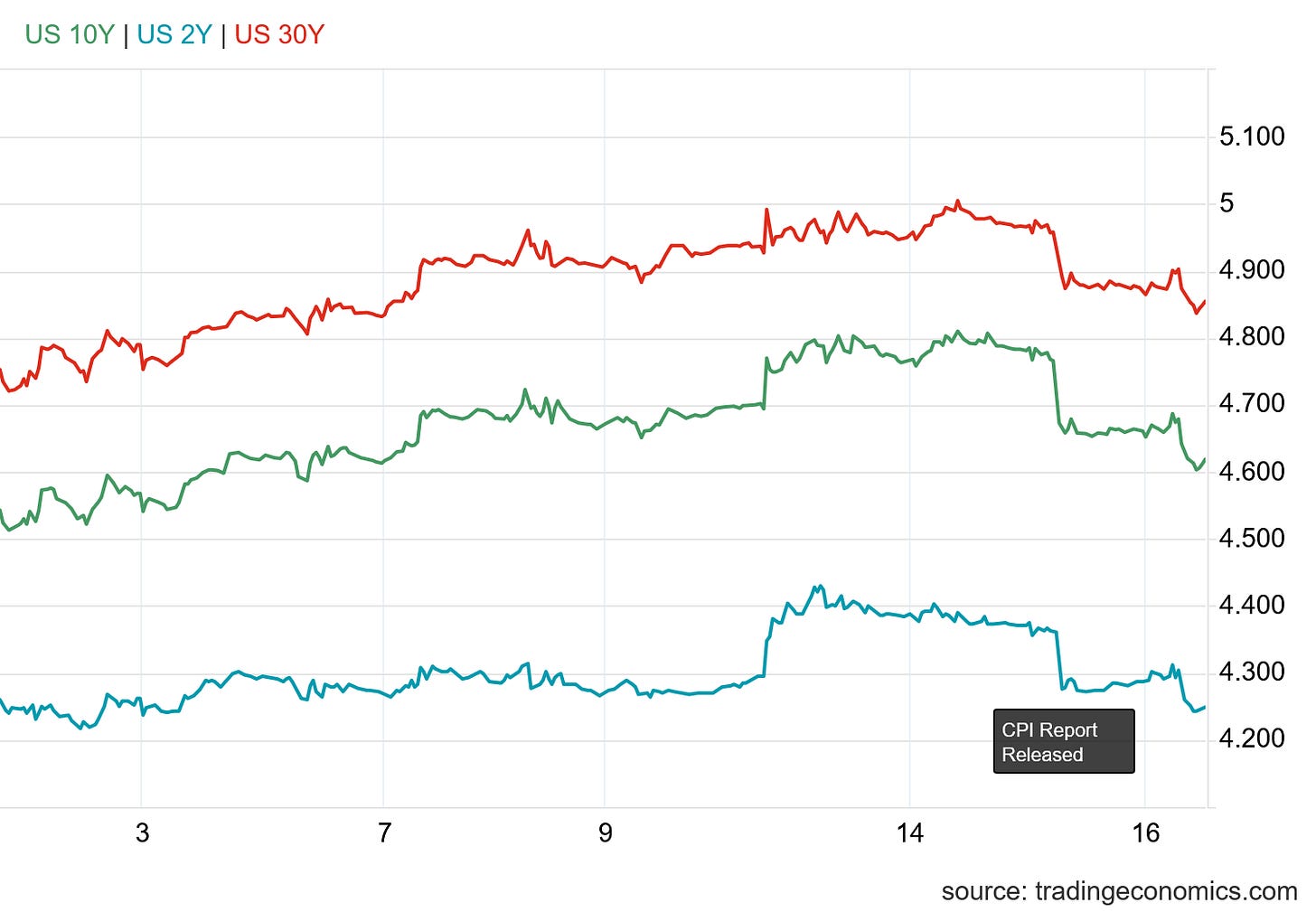 The timing for both equities and treasuries leaves little doubt that the moves were in response to the CPI report being released.