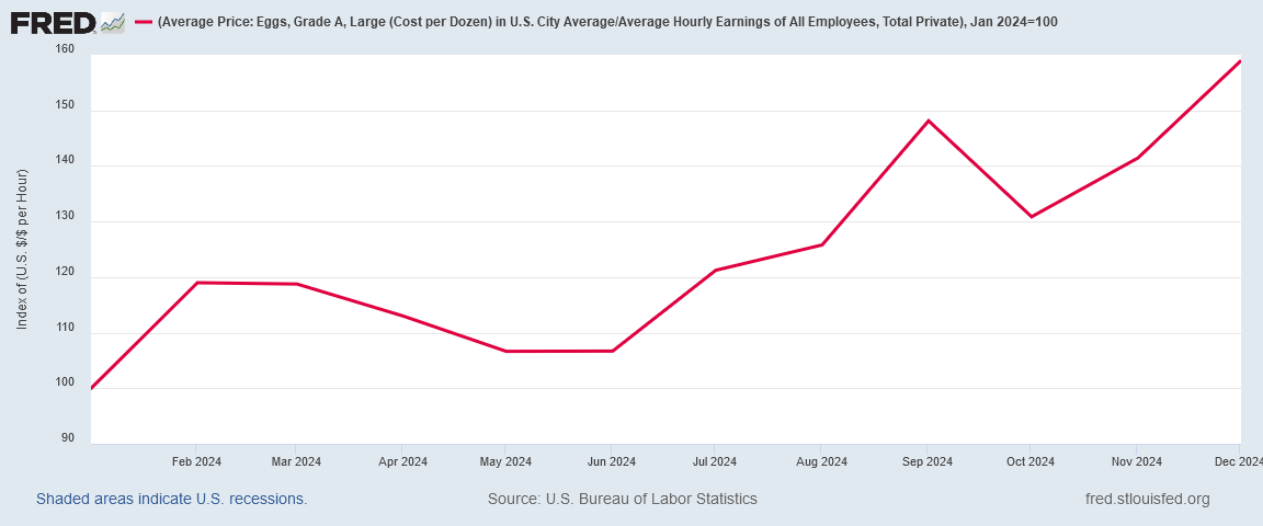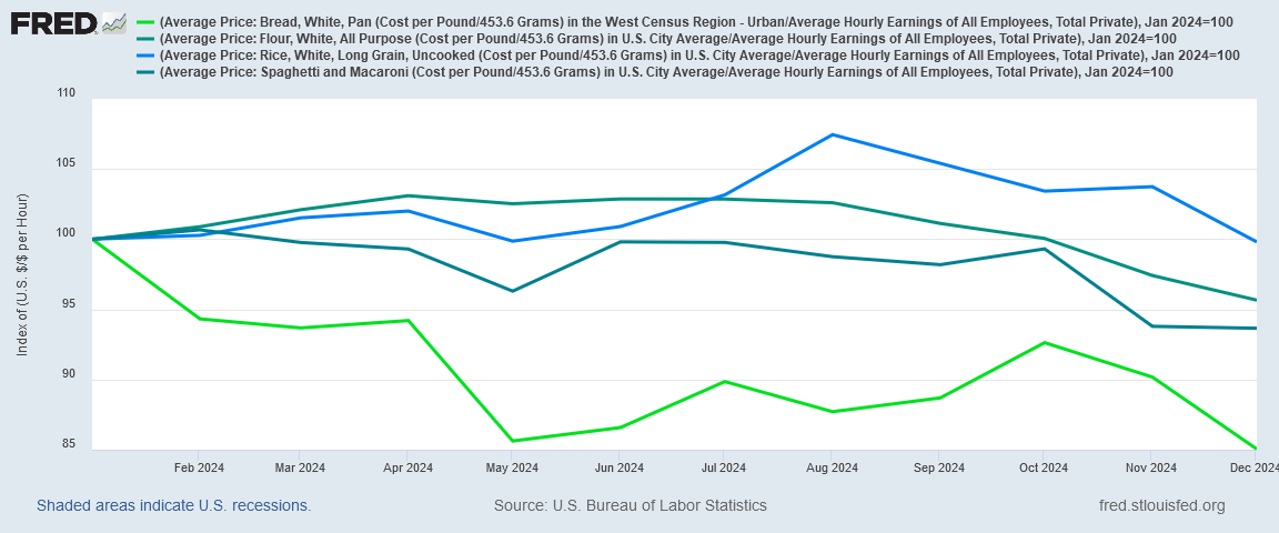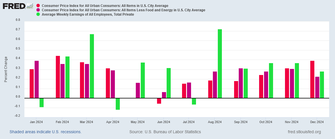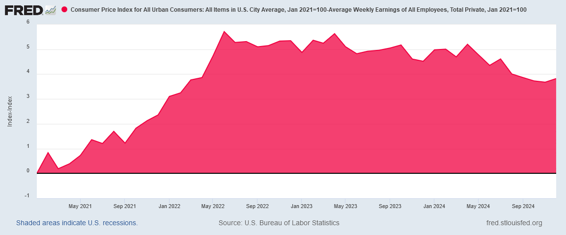 Until this chart trends back down to zero, wages have not risen enough to offset the relative pricing effects of consumer price inflation. Ominously, in December the variance between the consumer price index and average wages ticked up again, instead of ticking down. While it is too soon to declare a trend reversal, it is not too soon to note that 2024 wound to a close with workers losing money in real terms to consumer price inflation.