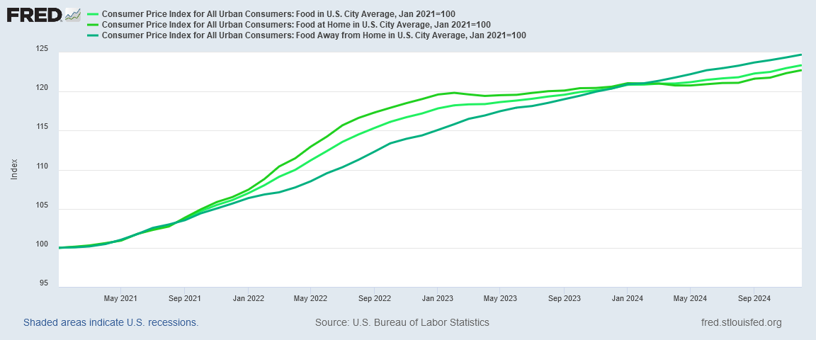 While food prices did not rise by quite as large a percentage month-on-month as they did in November, the rise was still significant. What we are seeing in the last part of 2024 is greater food price inflation than we saw earlier in the spring and summer.