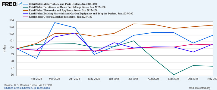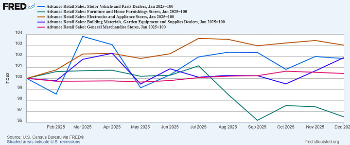 Even indexing the data reveals that only the Furniture category saw a decline in sales volume over 2025 in both the Advanced Estimate and the Retail Estimate.