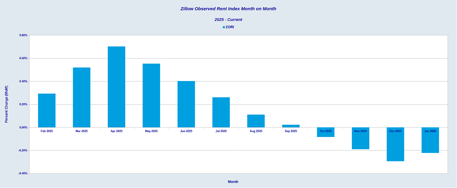 Even the forward looking Zillow Observed Rent Index shows month on month deflation for shelter.