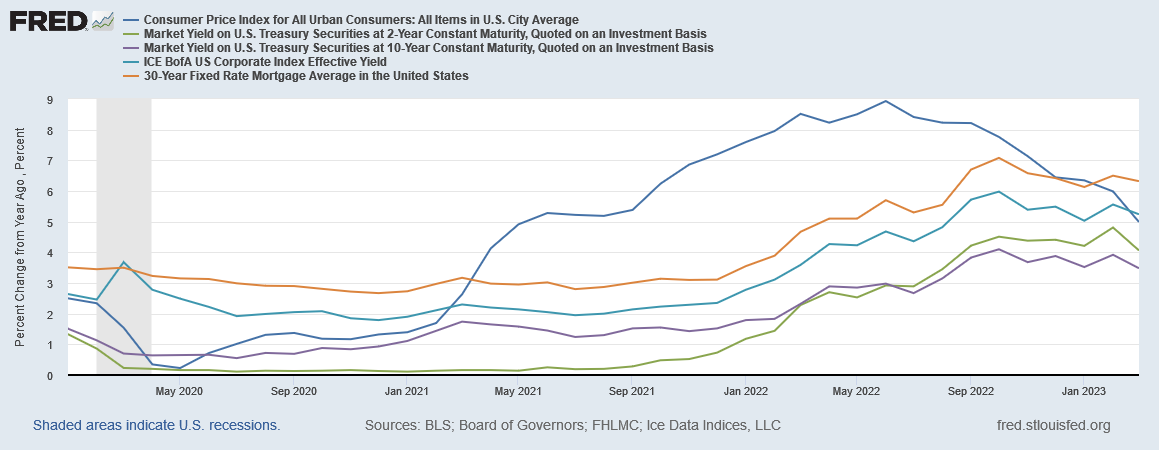 The perverse irony here is that, with headline consumer price inflation having come down to 5%, it is now coming in below market interest rates. Year on year inflation is now less than a 30-year mortgage interest rate as well as the effective yield on investment-grade corporate debt.