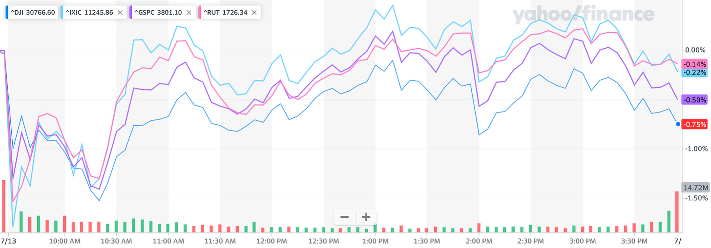 The Dow Jones Industrial Average dropped 208.54 points, or 0.67%, to 30,772.79, while the S&P 500 dipped 0.45% to 3,801.78. The Nasdaq Composite slipped 0.15% to close at 11,247.58.
