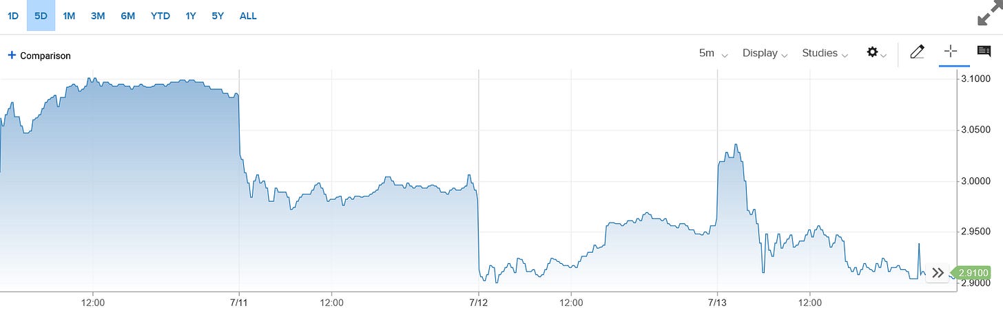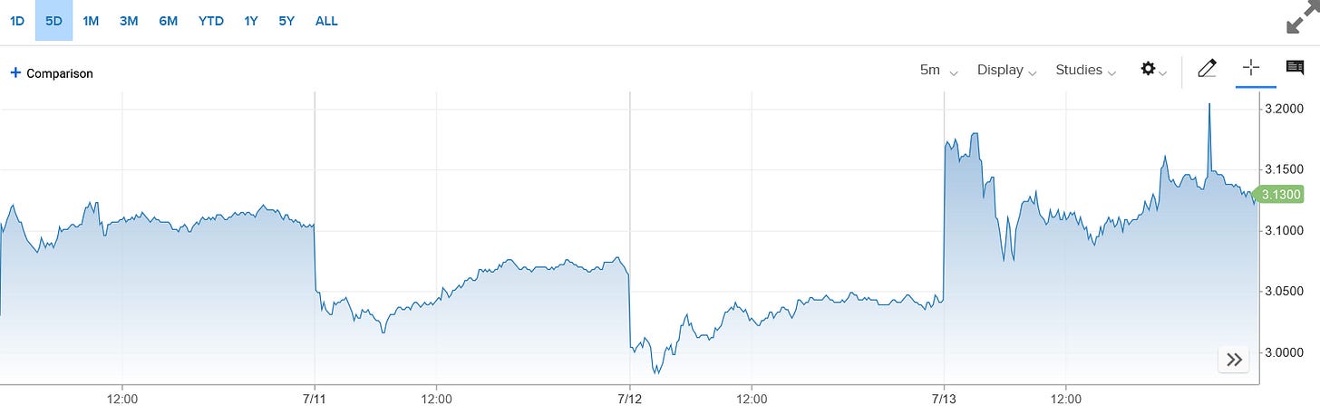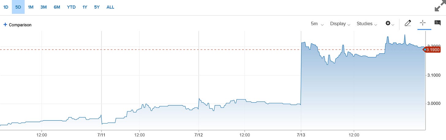 The 1-Year Treasury, which actually inverted with the 10-Year on Tuesday, started yesterday by spiking above 3.2% before ending just below at 3.19%.