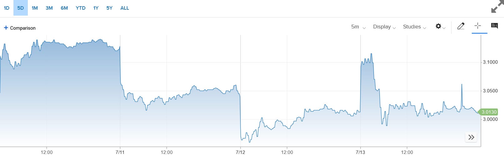 The 5-Year Treasury, after jumping up initially, ended the day unchanged at 3.013%.