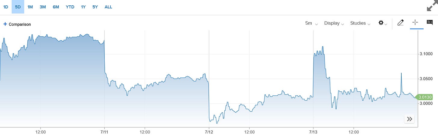 The 2-Year Treasury also spiked, although not quite as high as the 1-Year, only flirting with 3.2% late in the day before closing the trading day at 3.13%.
