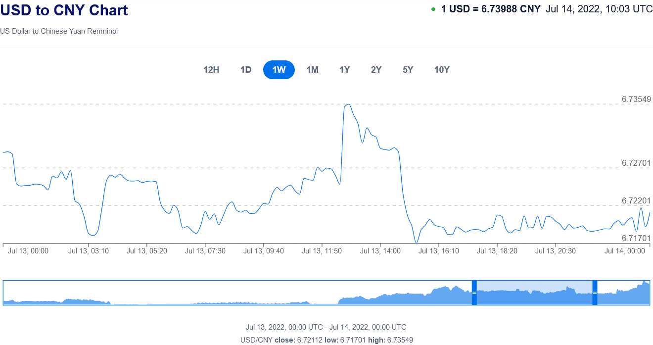The dollar did drop modestly against the Chinese yuan yesterday, from 6.72904 CNY to 6.72112, although the initial reaction just after the inflation report came out was to increase against the yuan.