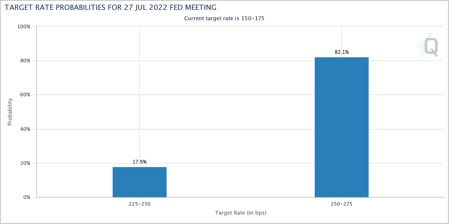 Financial derivatives marketplace CME Group is currently pricing in over an 82% probability of a full percentage point (100bps) hike in the Federal Funds rate, with around 17% probability of “just” a 75bps hike.