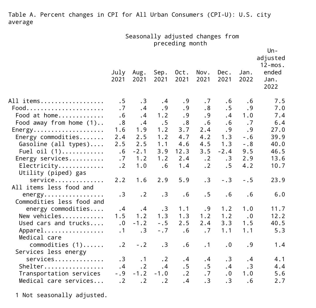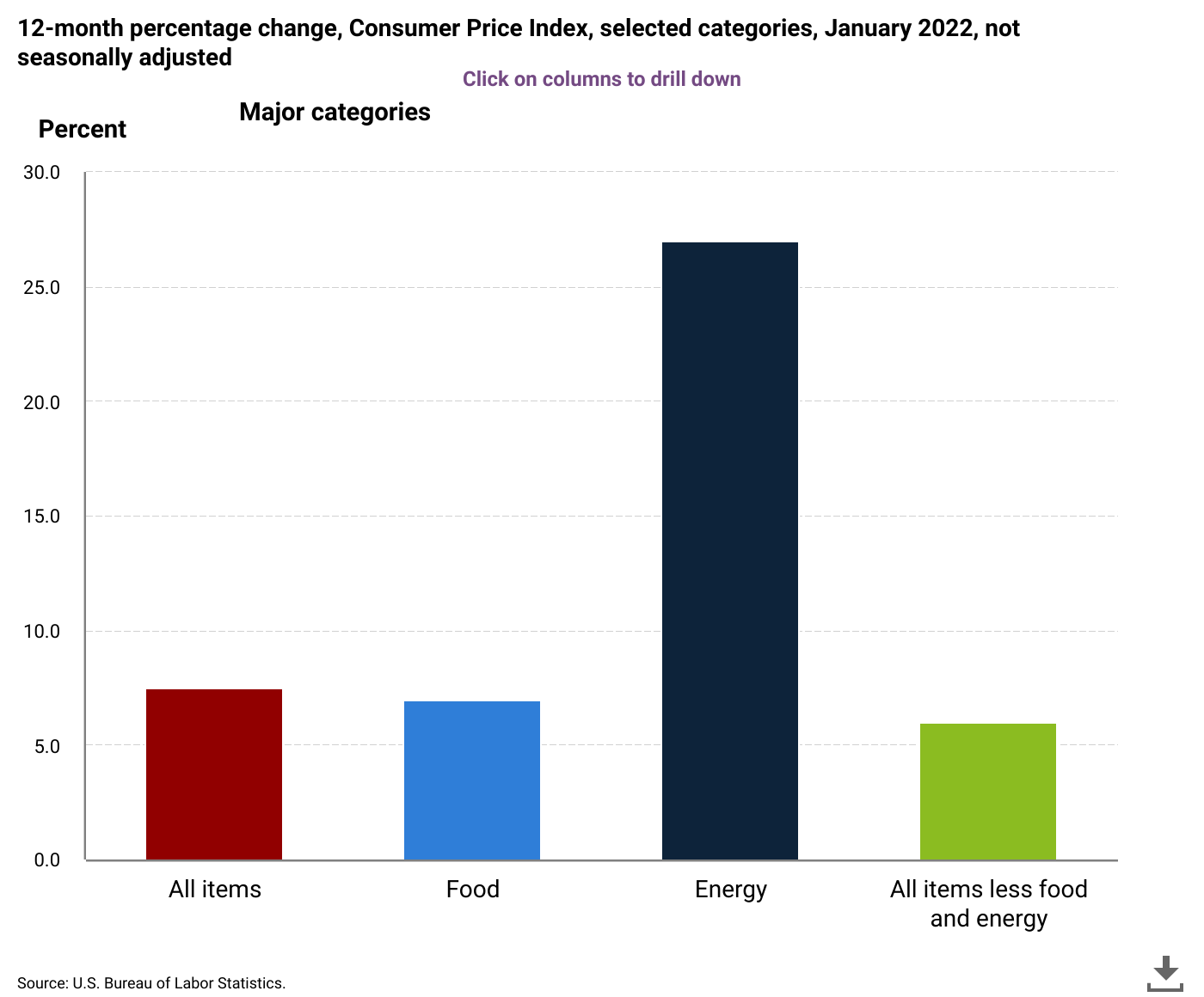 The all items index rose 7.5 percent for the 12 months ending January, the largest 12-month increase since the period ending February 1982. The all items less food and energy index rose 6.0 percent, the largest 12-month change since the period ending August 1982. The energy index rose 27.0 percent over the last year, and the food index increased 7.0 percent.