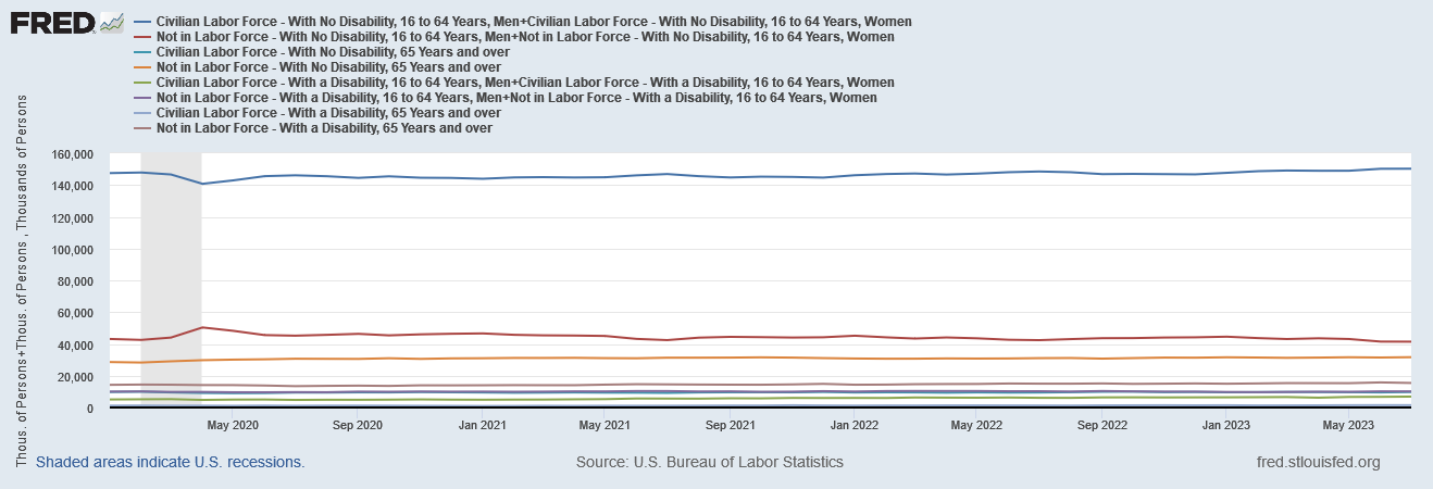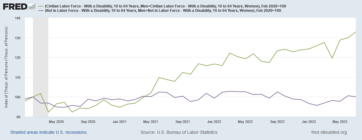 If we index the demographic cohorts to the start of the Pandemic Panic Recession, we see that men and women, 16 to 64, with no disability rose 1.6% as a part of the labor force by July, 2023, while the portion of that same demographic not in the labor force declined by 2.6%.