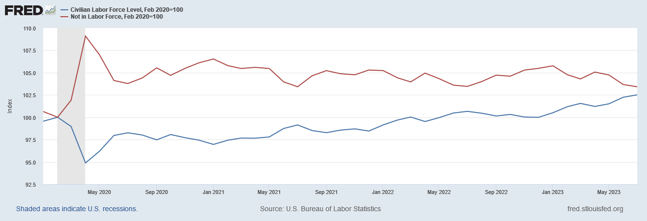 In the aggregate, when we look at the broad unadjusted labor force participation numbers, we see that the labor force in the US has grown since the start of the Pandemic Panic Recession by 2.5%, but that cohort of the civilian population not in the labor force has grown by 3.4%.