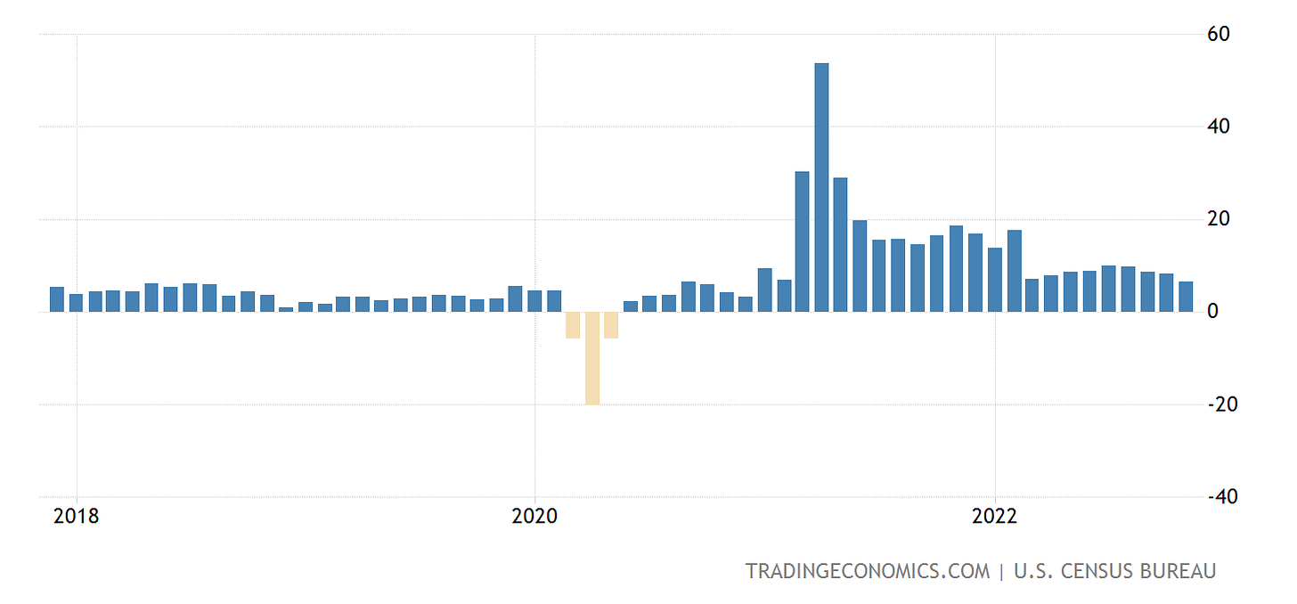 Even viewed year on year, retail sales in the US have been softening in recent months, and are becoming weaker than pre-pandemic levels.