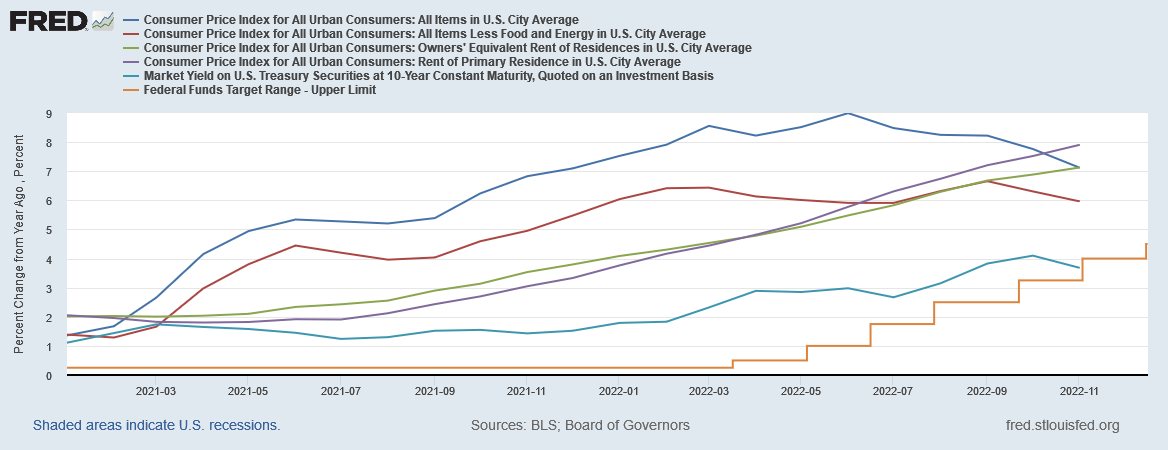 With inflation likely to remain elevated for some time into 2023, the Fed is likely to keep raising rates into 2023—but this last rate hike shows the Fed is exerting almost no influence over inflation or interest rates. Barring a major change in overall economic conditions, there is little reason to expect the Fed to regain control over interest rates, while the inflation data demonstrates once again the Fed has never had much influence over consumer price inflation, despite the persistent myth of an inflation-slaying Paul Volcker from the early 1980s.