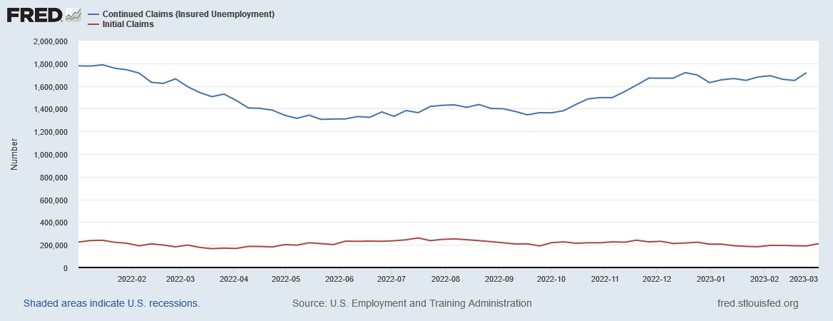 Initial jobless claims jumped to 237,513 last week on an unadjusted basis, while continuing claims rose to 1,975,193 for the week before (continuing claims always lag by one week).