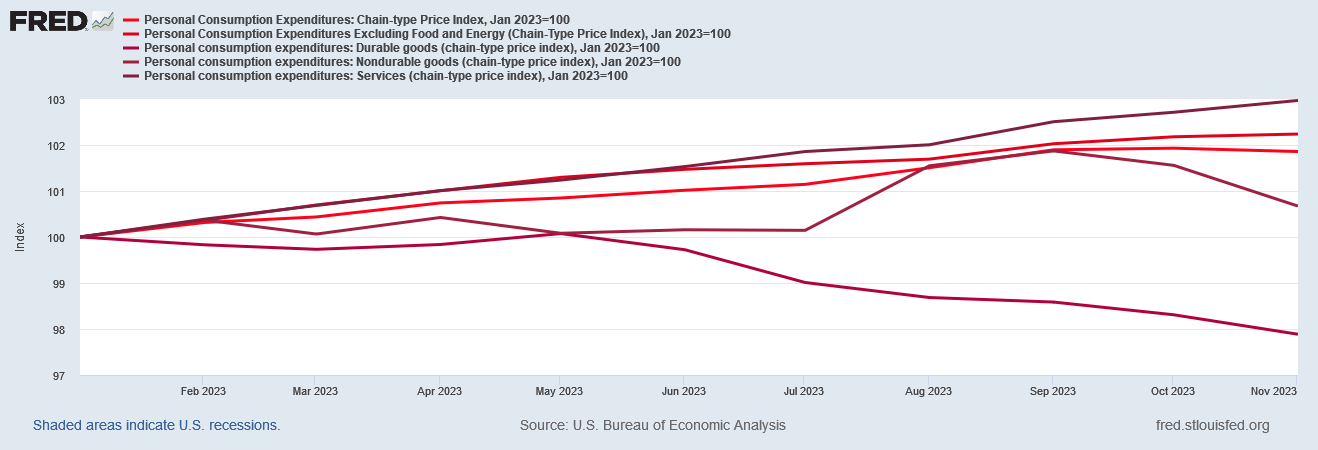 Nor should we overlook the growing price distortions being imposed on consumers by inflation. While durable goods have been in deflation for a while, and non-durable goods are now following suit, service price inflation has not ameliorated at all.