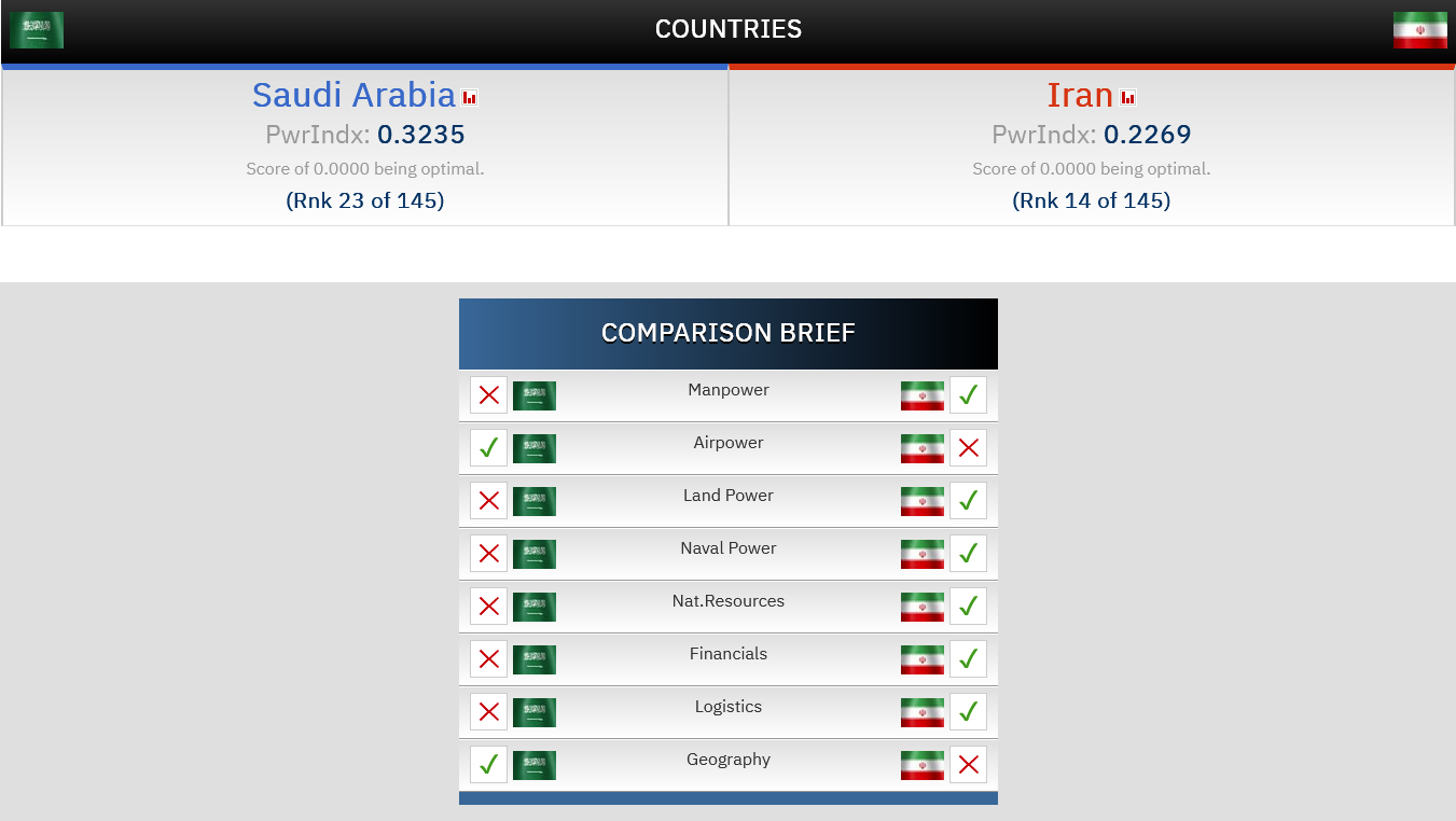 A Global Firepower comparison2 of Saudi and Iranian strengths show that Iran bests the Saudi in several categories, both military and economic.