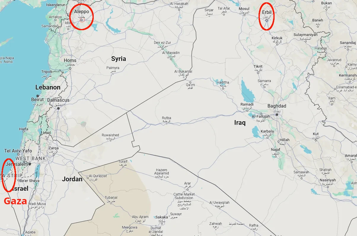 Neither Aleppo, the epicenter of Iran’s attack on Syria, nor Erbil, the capital of Iraq’s semi-autonomous Kurdish territory, are anywhere near Israel or Gaza.
