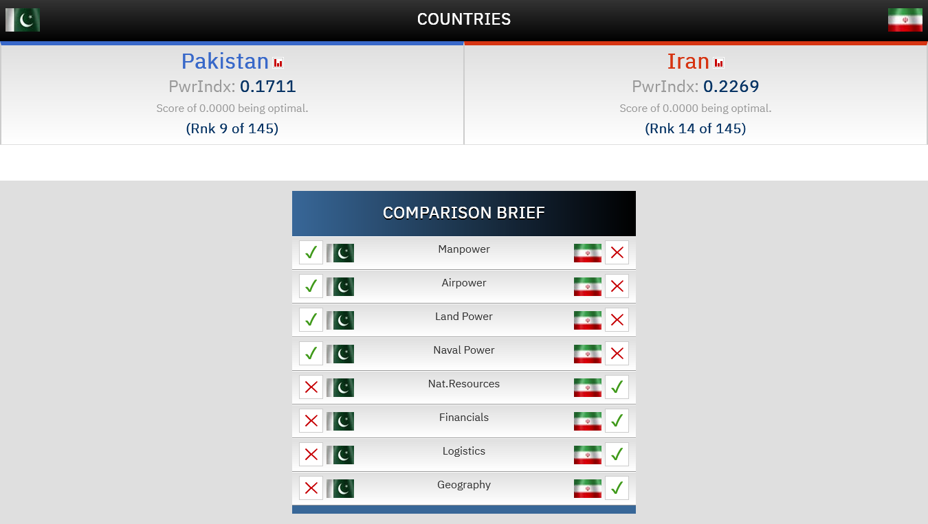 Global Firepower. Comparison of Pakistan and Iran Military Strengths (2024). 9 Jan. 2024, https://www.globalfirepower.com/countries-comparison-detail.php?country1=pakistan&country2=Iran.
