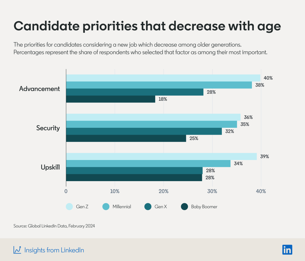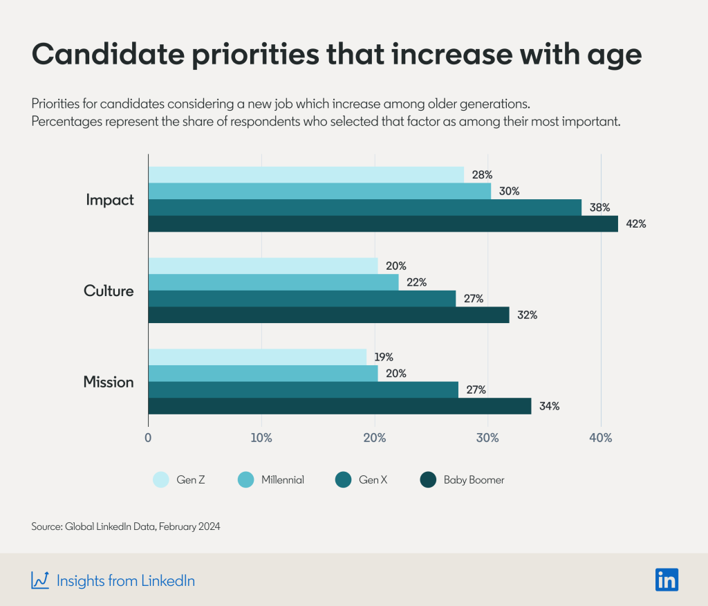 According to the Future Of Recruiting 2024 survey2 by business-oriented social media platform LinkedIn, older job candidates are consistently more likely to prioritize socially oriented factors such as “impact” over personal priorities and values.