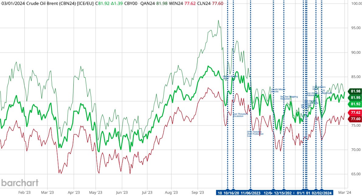 The primary reason for the EU’s disinflation trend overtaking that of the US is that the US trend more less ended in late summer of last year, as oil prices began moving back up again. Somewhat surprisingly, energy prices seem to have less impact on overall prices structures in Europe than in the US, which we can see when we look at the prices for Brent Crude and West Texas Intermediate oil.
