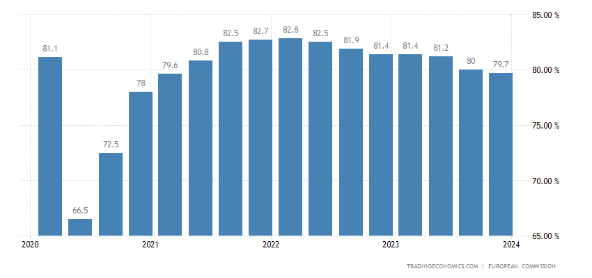 The EU is proving to be an interesting economic laboratory. With the manufacturing base in contraction for well over a year, Europe is steadily producing less, and its capacity utilization is lower than it was right before the Pandemic Panic lockdowns.