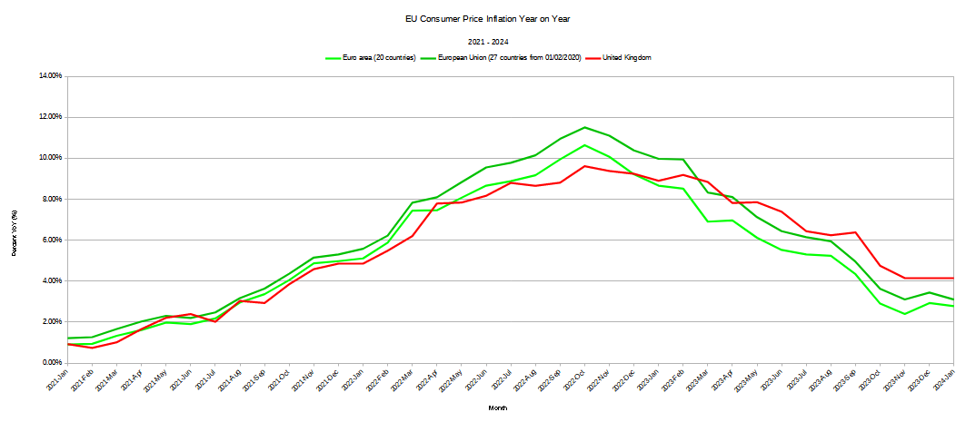 Perhaps more noteworthy is that month on month inflation has been softening steadily since the spring of 2023. Inflation pressures are easing up on the EU economy.