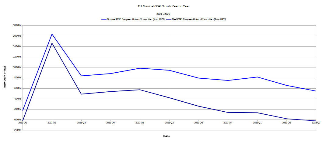 Nor is it terribly hard to see why this is happening. When we look at nominal GDP growth vs real GDP growth for the EU, we quickly can see the destructive impacts of inflation in the widening gap between real and nominal GDP, with real GDP steadily being eroded thanks to persistent inflation.